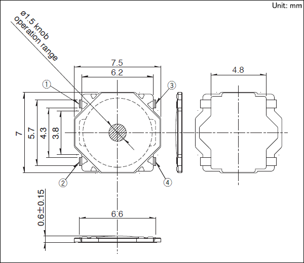 - 碳接触点具有因推压负荷接触电阻发生变化的特性。用于电压分压回路等时,请在充分确认之后使用。