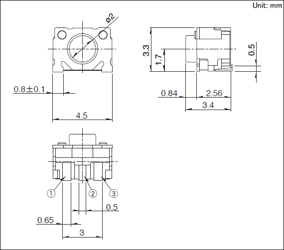 - 碳接触点具有因推压负荷接触电阻发生变化的特性。用于电压分压回路等时,请在充分确认之后使用。