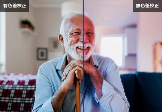 如果比较补正和没有补正,您可以看到右侧没有消色差透镜的图像是偏红的。