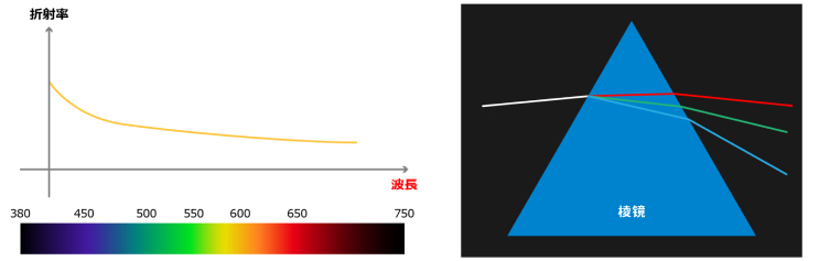 如您所知,光有蓝色、绿色、红色等“颜色”。 每种颜色都有自己的波长和不同的折射率(如图1)。这就是为什么您可以使用棱镜来分离颜色的原因。 例如,长波长的红色折射不大,相反,短波长的蓝色折射很大。 因此,当光线通过普通凸透镜时,焦点位置与图2所示不同。 这称为色差。