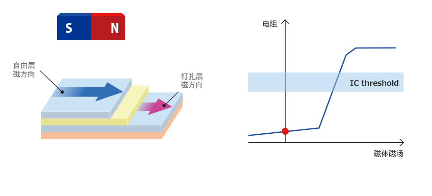 利用了电阻值随着钉扎层与自由层的夹角而变化,相同时电阻值最小,反之电阻值最大这一性质。