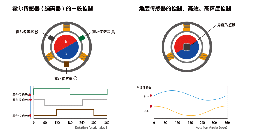 霍尔传感器(编码器)通常需要3个角度传感器,而本公司的磁式传感器只需1个传感器即可检测出线性旋转角度,实现马达的高效、高精度控制。