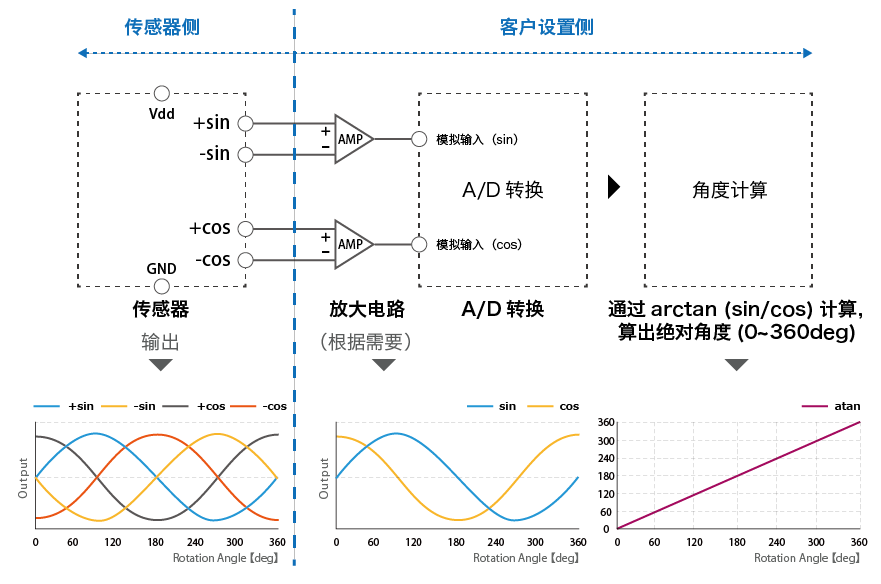 将从上述传感器中输出的+sin, -sin, +cos, -cos 这4个信号根据需求在客户设置侧增强。根据sin/cos计算,信号仅取决于磁场角度,不受磁场强度影响。通过arctan(sin/cos)计算,可算出绝对角度。