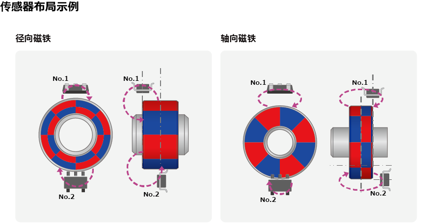 由于本公司的编码器型磁式传感器是无间距的,所以即使改变磁铁的极数也无需变更布局。