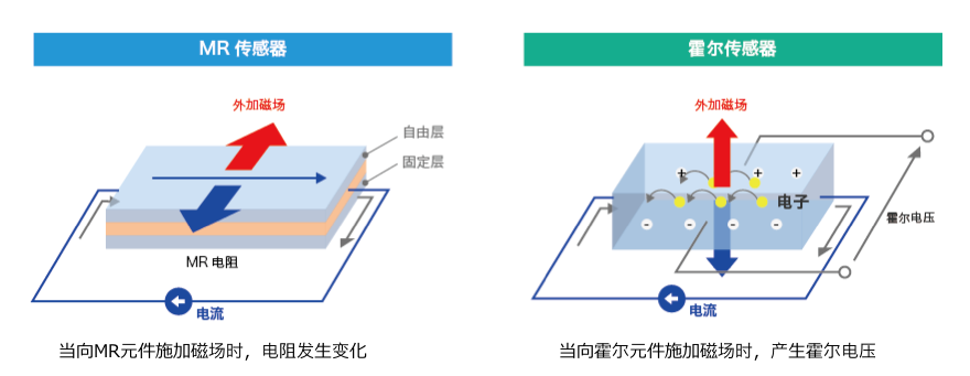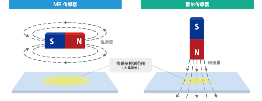 相对来说,霍尔传感器检测垂直磁场的强度,而MR传感器检测水平磁场的角度。
