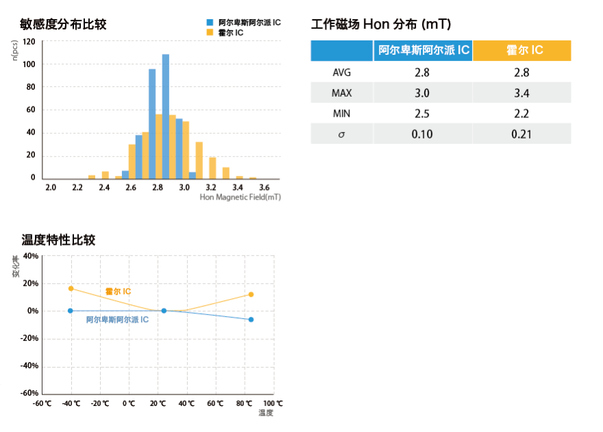 除了上述检测范围和S/N比以外,本公司的磁式开关比霍尔传感器的灵敏度更均衡,对温度变化也稳定。