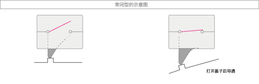 普通开关多为按下操作杆后接点开启的类型,相反也有按下操作杆时关闭的类型。前者为常开型、后者为常闭型。例如,对移动设备与电动汽车等希望控制电力消耗的设备进行盖子或车门开闭检测时,常闭型可在通常关闭的情况下用于切断线路。
