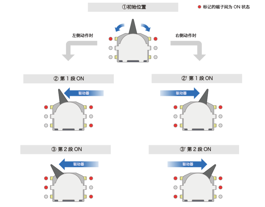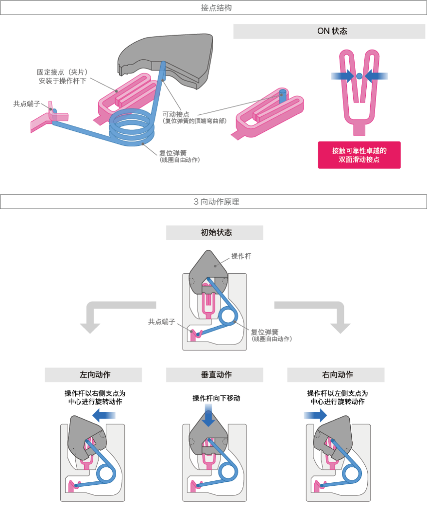 SPVL系列可以通过1个开关检测在垂直和左右3个方向上的操作。以下为您介绍其接点结构与动作原理。