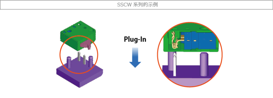 SSCW系列和SSCL系列由于自带连接器端子(母端),只需插入公端端子即可连接(免焊)。