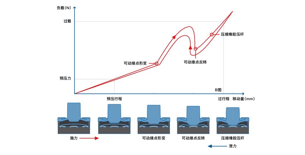 TACT Switch™ 系列有行程约为 0.4 至 0.9 毫米的中间行程型开关,其特点是压杆采用弹性橡胶,在按压可动接点之前有一个预压行程,而在可动接点反转之后则有一个过行程(见下图)。这个预压行程的增减可以调整开关操作的舒适度。