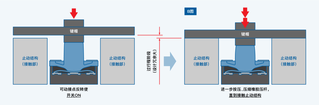 利用开关的过行程,可调节开关按压到底的冲击感。