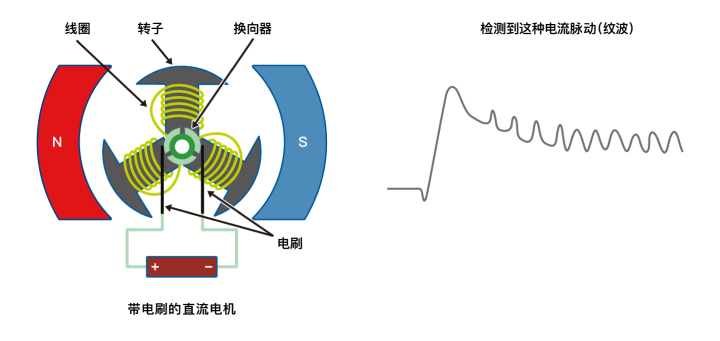 为了控制电机,通常使用磁传感器等来检测转数和旋转角度。相反,如果电机是带电刷的直流电机,则可以通过检测电刷的电流脉动(纹波)来检测转数和旋转角度。此外,还可以同时检测负载电流。
