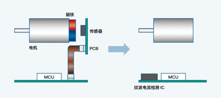 电流纹波检测IC可以安装在 MCU 板上等,无需安装在电机附近,提高设计自由度。