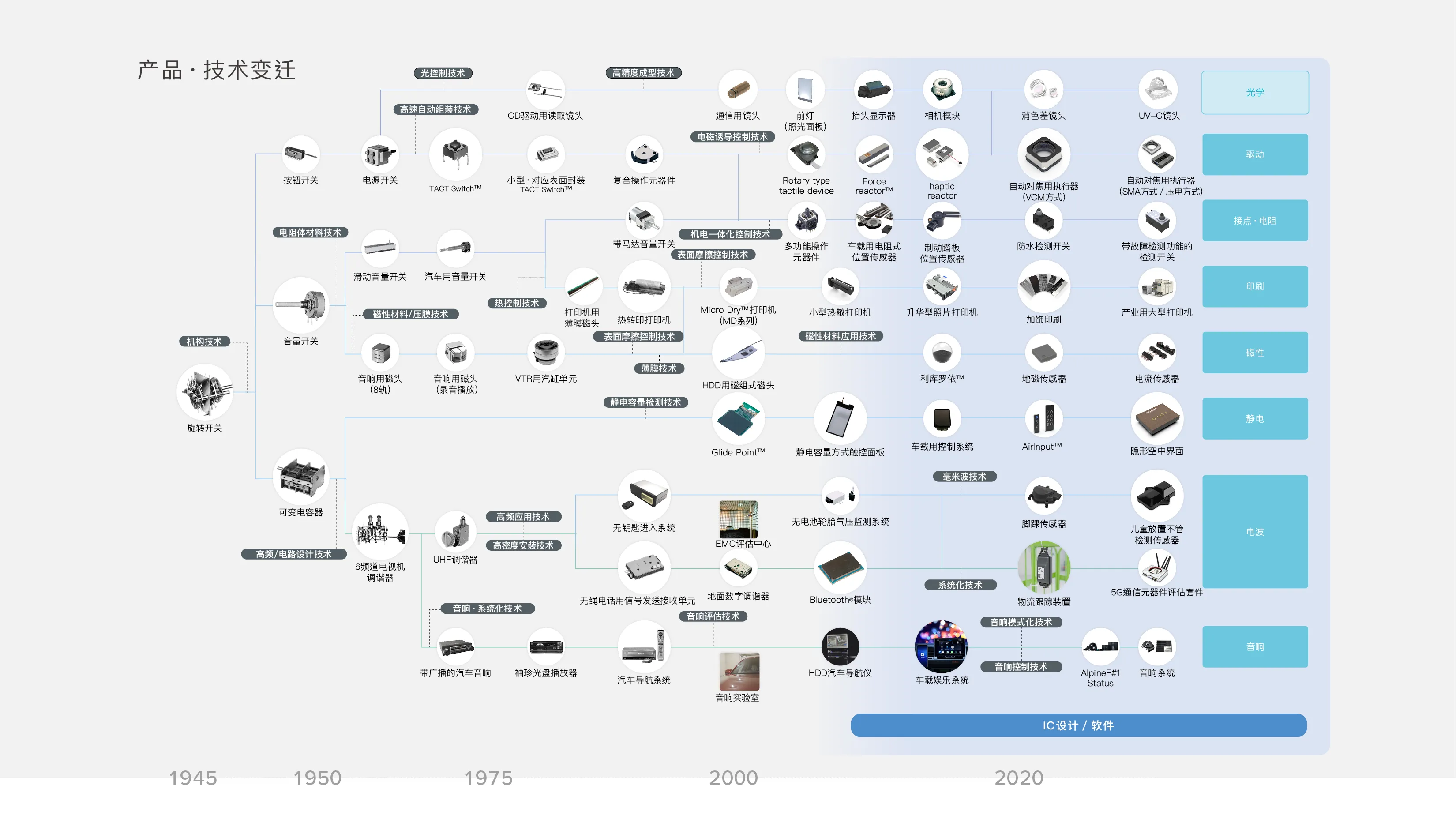 阿尔卑斯阿尔派的技术的原点,是通过“旋转开关”培养的设计机器的动作和构造的机构技术。 伴随日本的高速成长及世界经济的发展等时代的变化,我们培育着各个时期所需的技术。