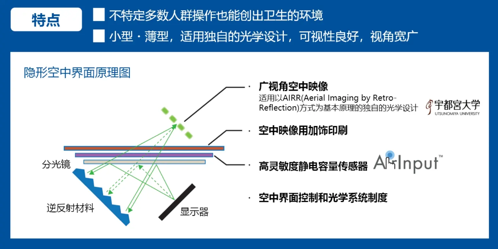 利用迄今为止积累的光学技术的知识,着眼于非接触需求,开发出“隐形空中界面”。在全球率先实现“可操作的空中显示”的本装置,2022年获得汇聚日本国内外最尖端科技的“CEATEC AWARD”的关键科技部门准最优秀奖。完全取代开关和按钮等机械性操作系统,具备仅在必要时通过姿态浮现显示的功能。这运用了用于利用激光读取和记录数据的镜头培养的光源控制技术。