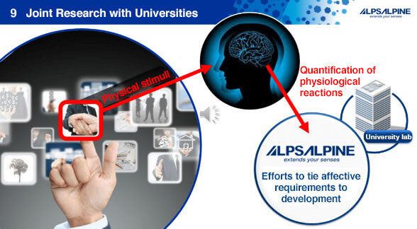 At Alps Alpine, we not only focus on enhancing the tactile quality of our products, but also dedicate efforts to deepening the technological expertise that underpins them. Here we introduce activities we undertake to further enhance our feel creation, including research through industry–academia partnership with scientific or academic bodies and collaboration with companies, both domestic and foreign.