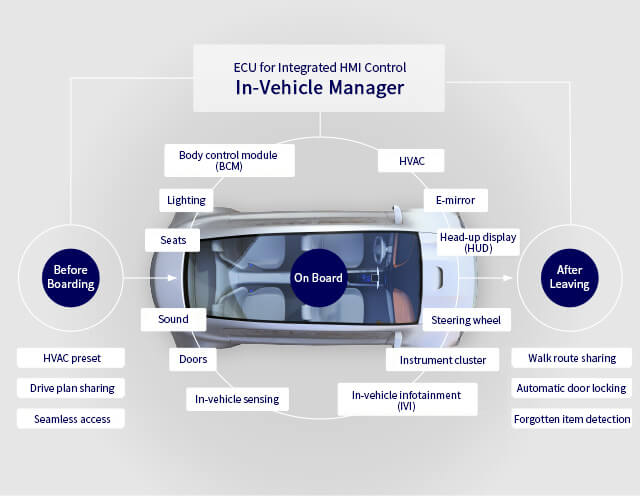 The aims of the In-Vehicle Manager are to achieve integrated control of everything seen and touched inside the vehicle cabin, including displays, the steering wheel, seats and climate control, and to realize a seamless mobility space taking in the entire experience, from before boarding to inside the cabin, and through to after leaving the vehicle. The systems we look to develop encompass, as you would expect, infotainment control – namely the delivery of information, music and video content – but also a broader scope, taking in control of in-vehicle devices, driver monitoring and other aspects of human-machine interfaces (HMI) for the user.