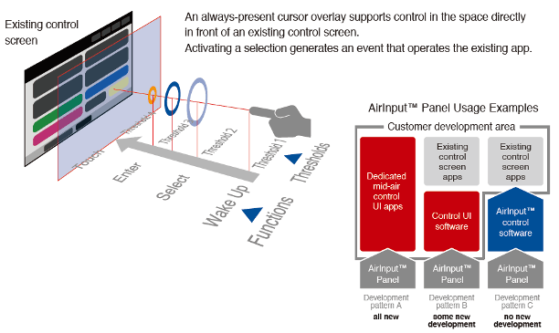 As an option for customers who wish to convert existing applications designed for touch operation into touchless applications but are unable to develop the software themselves, we also provide AirInput™ Panel dedicated control software for Windows. Installing the software allows customers to omit the software development process and utilize existing input screens in a touchless setup. Customers can adjust user interface settings, colors, sizes and other parameters on the settings screen to achieve the desired operating feel and realize a wide range of touchless operation scenarios.