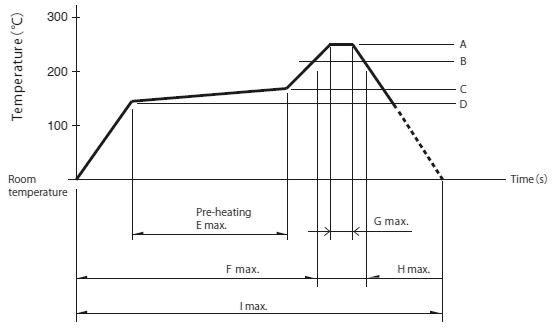 (2) The temperatures given above are the maximum temperatures at the terminals of the sensor when employing a hot air reflow method. The temperature of the PC board and the surface temperature of the sensor may vary greatly depending on the PC board material, its size and thickness. Ensure that the surface temperature of the sensor does not rise to 250℃ or greater.