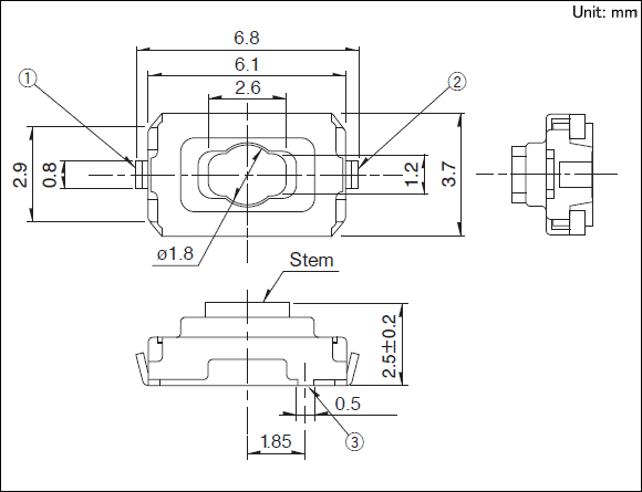 - Be sure to push the center of switch for “without-stem” type. Extreme care is required for a hinge structure type, as the activation point may shift when it is pressed down.