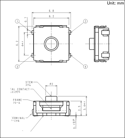 - Contact resistance of a carbon contact type may vary depending on push force. Confirm that it functions sufficiently in using TACT Switch™ with a voltage divider circuit.