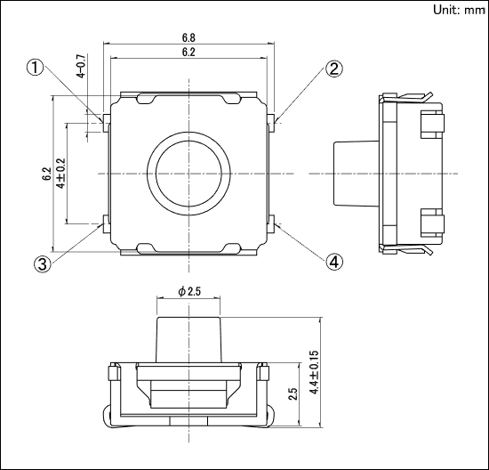 - The sizes of holes and patterns on a PC board for mounting a switch, be asper the recommended dimensions in the product drawings.