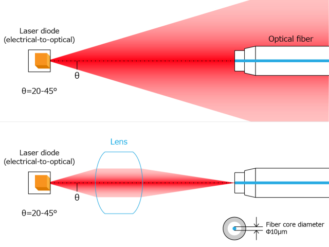 At the other end, light emerging from optical fiber also diverges. The light is focused through a lens and directed into a photodiode.