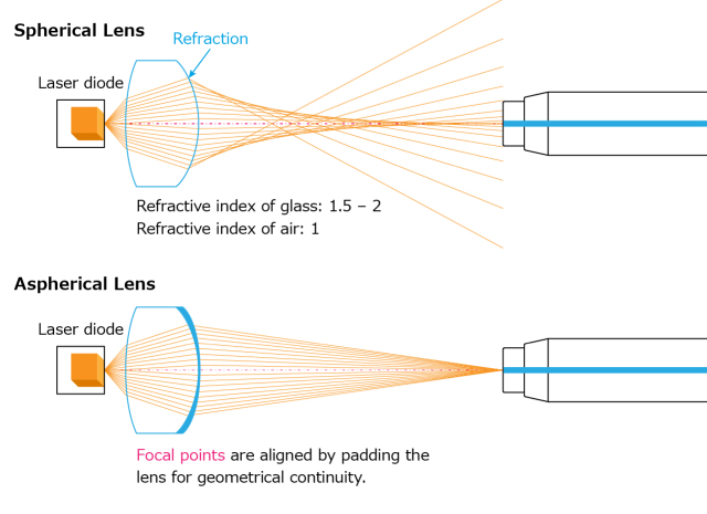 Using a spherical lens, light does not converge in one place, leading to what is called “aberration.” Aspherical lenses get close to zero aberration, making it easier to focus light in one place.
