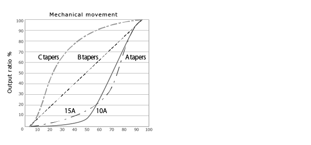The set of characteristics showing the change in output voltage (or resistance) between terminals 1 and 2 of a potentiometer in relation to the rotation angle or travel