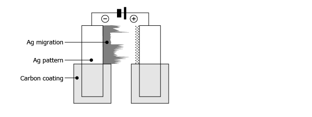 Migration is the phenomenon whereby a layer of moisture that forms on the resistor substrate, when used for long periods in high-temperature, high-humidity conditions, allows silver to migrate from the positive to the negative pole, causing a drop in insulation resistance or a short circuit. Countermeasures include widening the spacing between the electrodes and coating the silver with carbon.