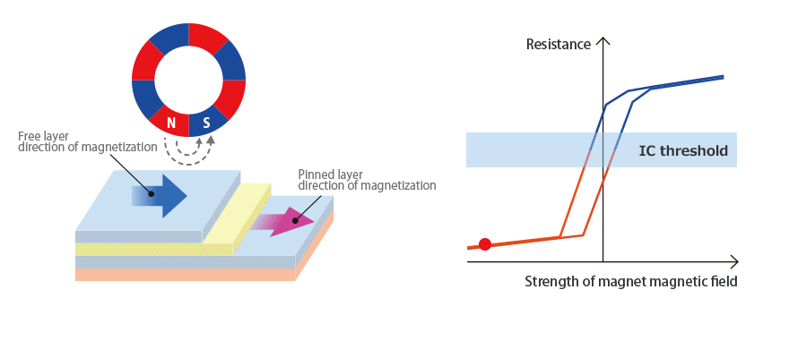 The basic operating principle is the same as for our magnetic switches in that changes in magnetic fields are converted into electrical resistance. That is then converted into voltage to become digital output in the form of a pulse signal.