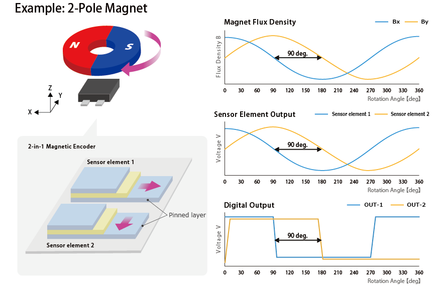 Additionally, because they are always sensing magnetic fields with a 90deg phase difference, sensor layout flexibility is high, allowing greater design freedom.