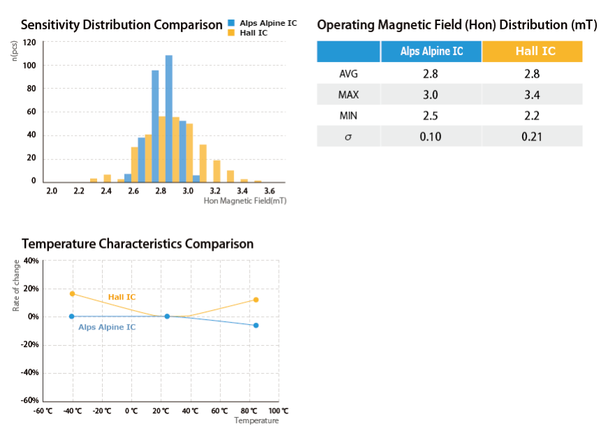 Besides the detectable area and signal-to-noise ratio mentioned above, Alps Alpine magnetic switches enjoy lower sensitivity variation than Hall sensors, allowing consistency even with temperature fluctuation.