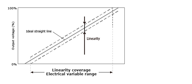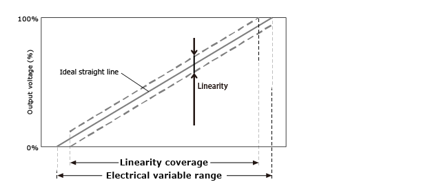 The electrical variable range indicates the variable range of output. However, the linearity coverage indicates the values within the electrical variable range. Both the electrical variable range and the linearity coverage are provided on each product.