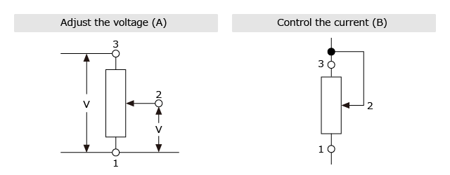 We recommend using resistive position sensors to adjust the voltage (Fig. A). Please do not use a resistive position sensor to control the current (Fig. B), because the set circuit might affect the contact resistance between resistive element and wiper.