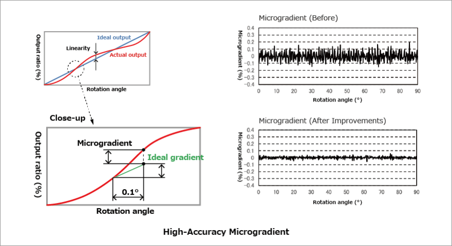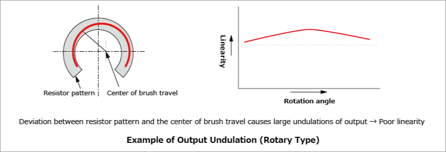 Large output undulations occur due to variance in resistor pattern thickness and positional deviation. In the case of rotary sensors, they also occur due to positional deviation of the resistor pattern and the brush's center axis.