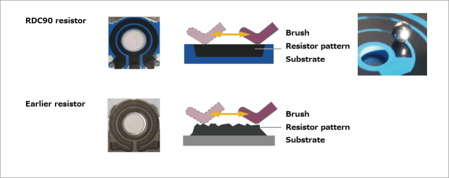 By incorporating this resistor in the RDC90 Series, friction between resistor and brush is reduced further, achieving an operating life of 10 million cycles.