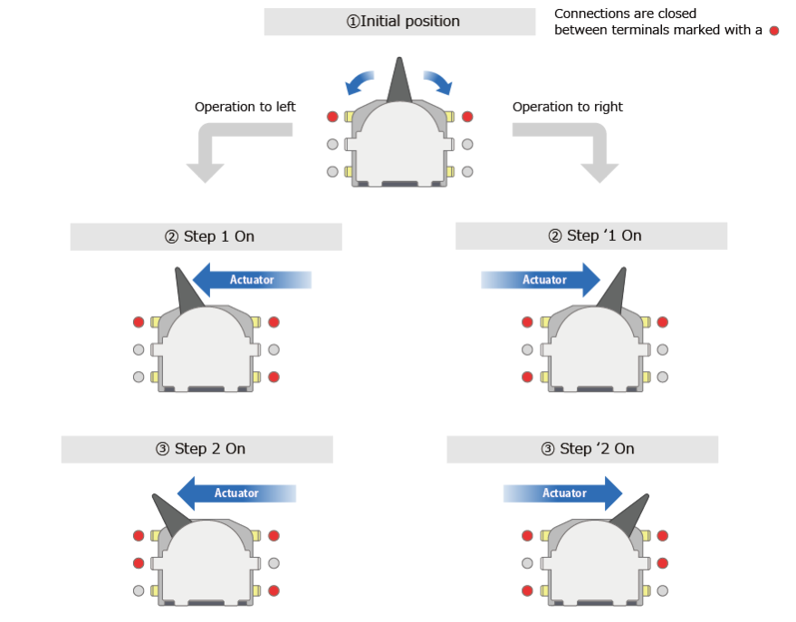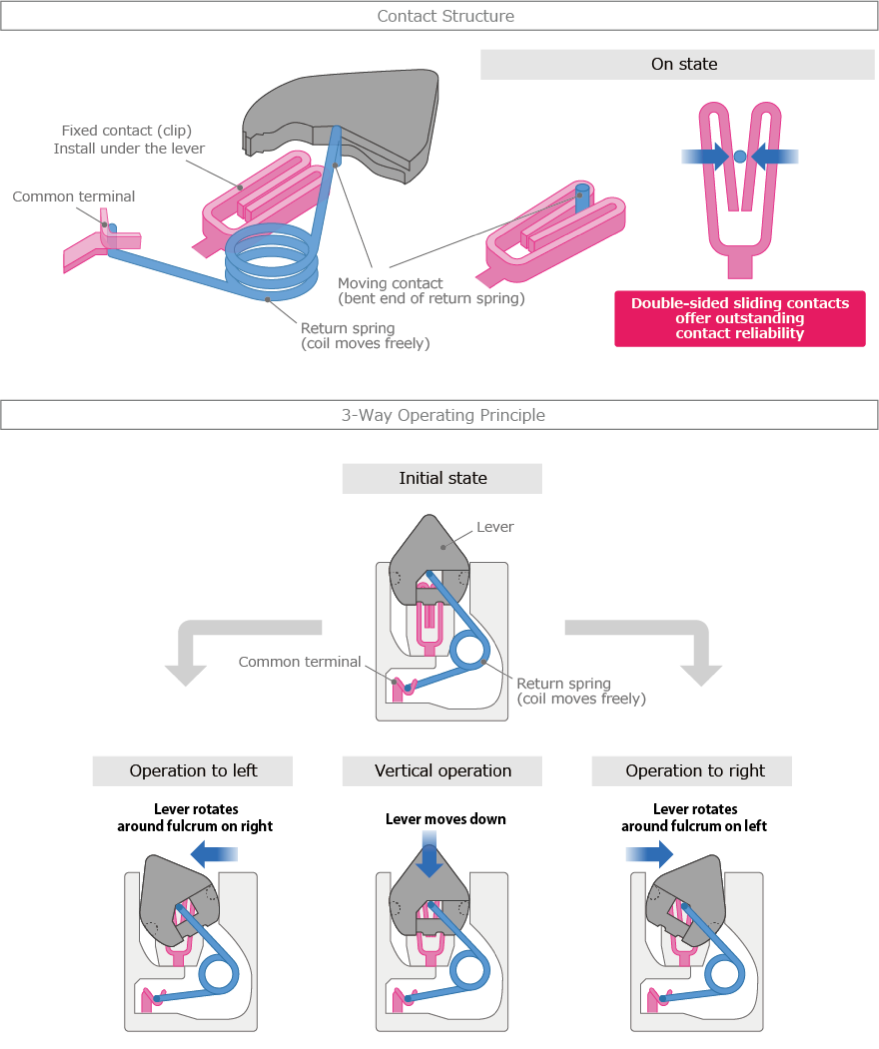 The SPVL Series can detect operation in three directions – vertically, left and right – as a single switch. Here we explain the contact structure and operating principle.