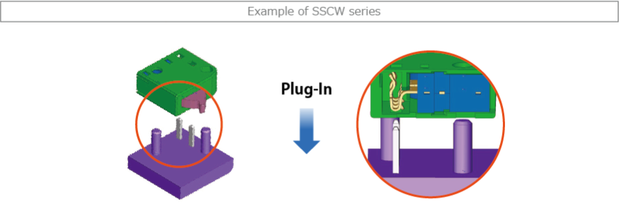 SSCW and SSCL Series have a connector terminal (female), allowing connection simply by inserting the terminal (solderless).