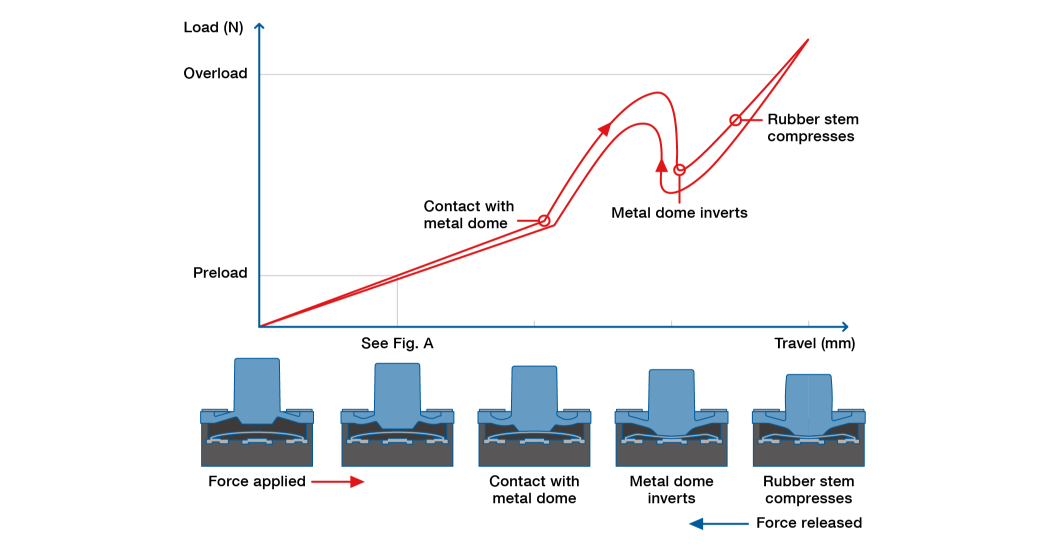 The TACT Switch™ lineup includes middle-stroke types, with a stroke (travel) roughly between 0.4 and 0.9mm. A feature of middle-stroke types is that when an elastic rubber stem is used, there is a preload prior to the moving contact being pushed, and an overload after the moving contact is fully pushed (see diagram below). The force used to push the switch influences the feel of the push.