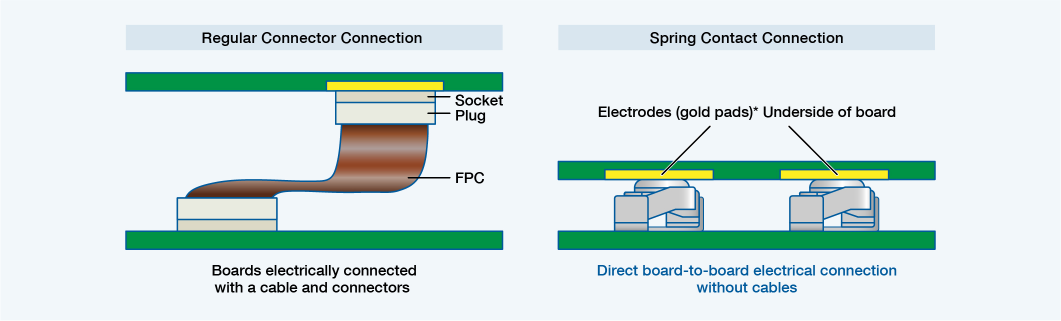 Spring contacts are electrical contacts with spring characteristics and a double-spiral structure (floating structure) allowing them to maintain contact even when there are vibrations and impacts, ensuring an appropriate stroke and contact load. Spring contacts enable direct board-to-board connection.