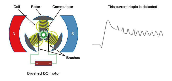 Until now, motor control has typically involved sensing the motor’s speed and angle of rotation using a magnetic sensor. If the motor is a brushed DC motor, rotation speed and rotation angle can be determined by detecting the current ripple at the brushes. Load current can be detected at the same time.