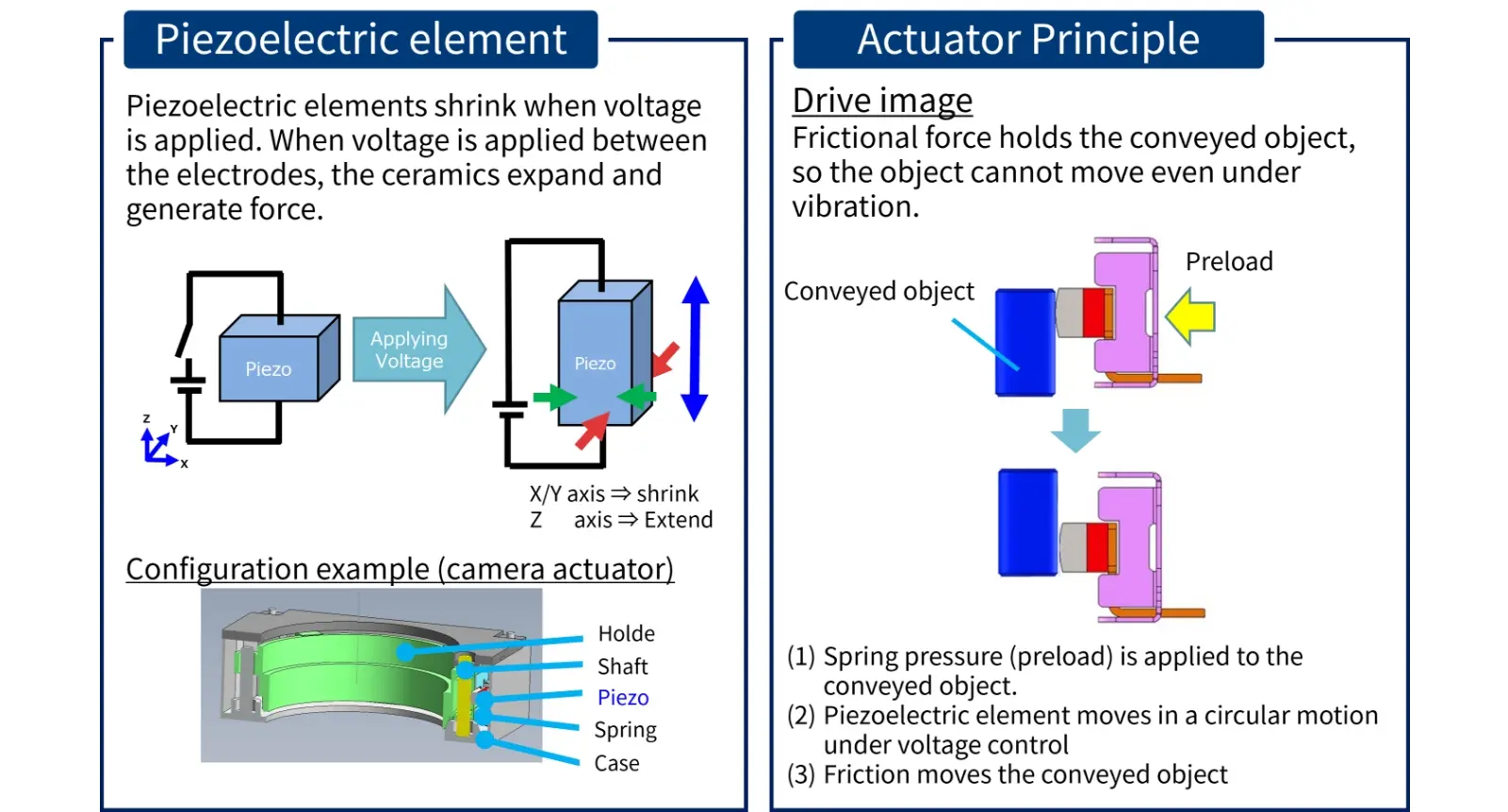 Piezoelectric actuators are another new form of actuator that has been under development since around 2018. Piezoelectric elements are one type of ceramic that, like SMA, expand and contract when electricity is run through them. While they can only expand or contract in one direction, stacking several piezoelectric elements makes it possible to create complex movements in vertical and horizontal directions. Piezoelectric actuators feature a high resistance to vibration, so they are expected to find uses in a variety of applications, such as in cameras for drones.