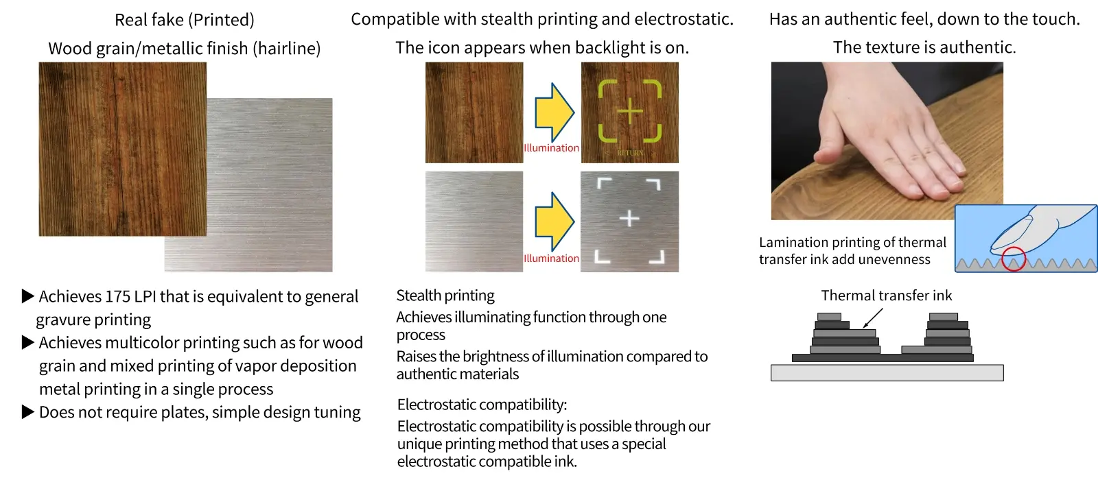 Further, Alps Alpine has developed a proprietary thermal transfer decorative printing technique by fusing its static technology with thermal transfer printing technology. Combining this with our unique printing method—in which we use a special ink that makes text and designs stand out when light shines on the print—we have created printed surfaces that make operable designs spring to life on flat surfaces that only appear to have wood grain or a metallic finish.