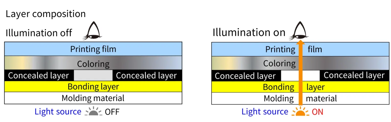 This decorative printing configuration can be used for purposes such as printing the operation screen directly on the wood grain interior of an automobile, and it will appear only when in use, for example. It makes possible the interior of the future, in which a limited amount of space can be used effectively.