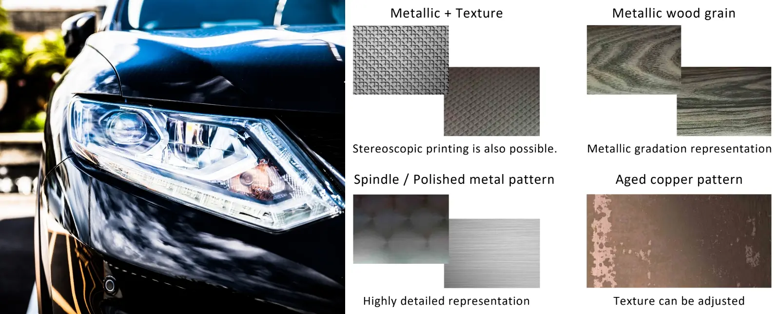 The films that we use make effective use of their high resolution and high-definition characteristics to make possible printing that would be difficult with the coating method. Various designs and textures can be created, such as coloring with gradients, defining fine lines, and reproducing realistic metallic textures.