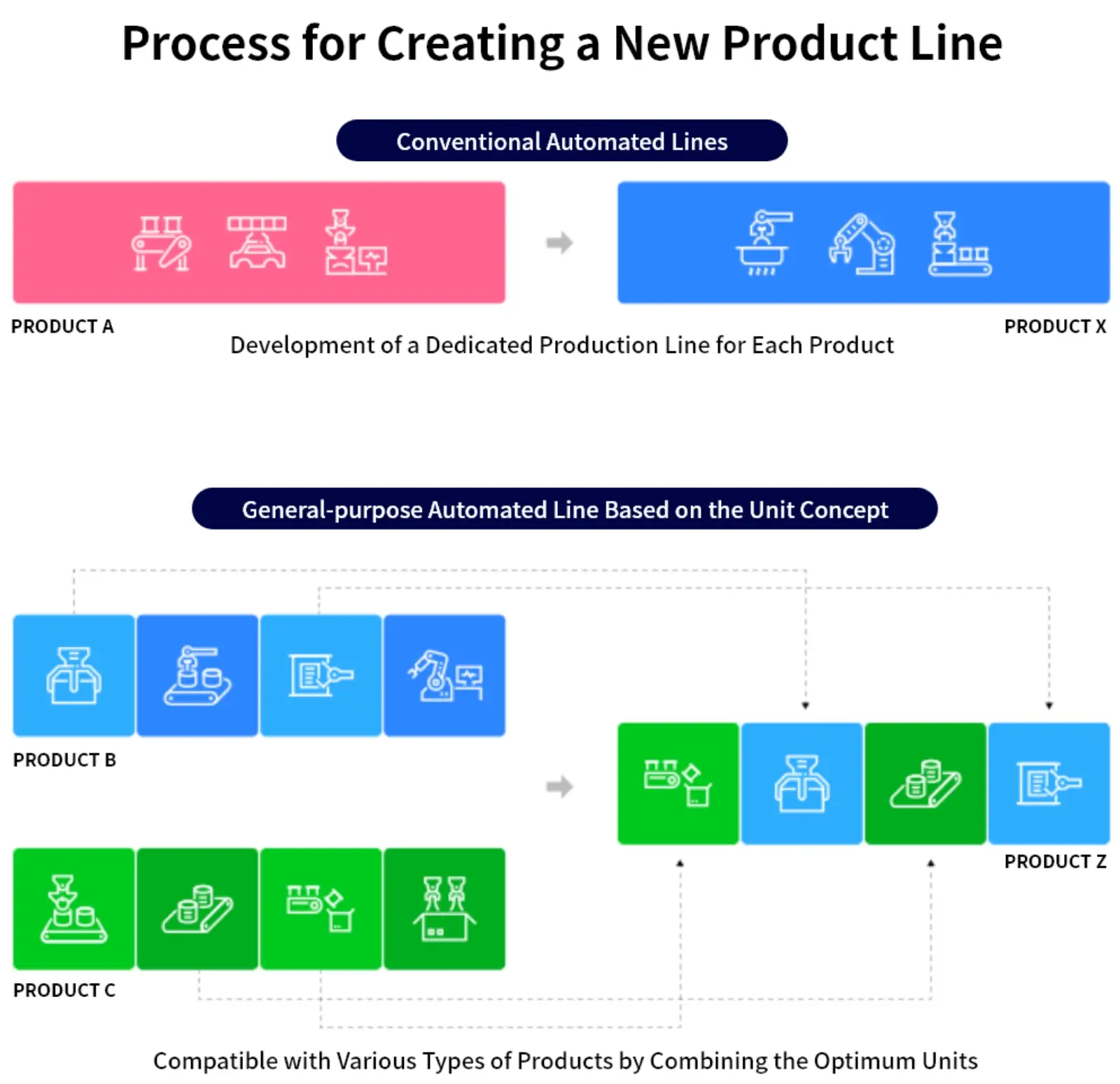 The Unit Concept is a production system that we created while in the process of generalizing production machinery. It divides the components of each automated process, such as the main process/transfer/supply stages, and combines the specialized and standardized parts used in each product. The system makes it possible to set up the optimal production line with reduced costs in a short period of time.