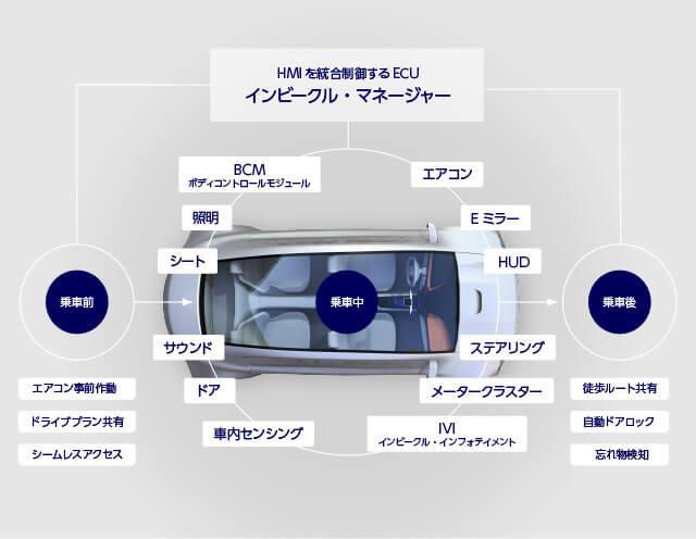 インビークル・マネージャーが目指すのは、ディスプレイ、ステアリング、シート、空調など車室内で人が見るもの触れるものを統合制御すること。そして乗車中のみならず、乗車前から降車後までを考えたシームレスな移動空間を実現することです。情報や音楽、動画コンテンツの提供といったインフォテインメントの制御はもちろん、車内デバイスの操作、ドライバーのモニタリングなど、ユーザーのHMI(Human Machine Interface)を幅広く想定したシステム開発を検討しています。
