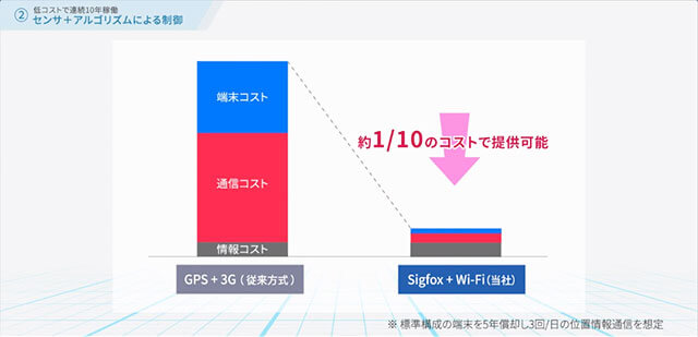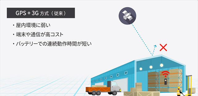 低消費電力・低コストを実現し、屋内外でシームレスに精度50mほどの位置測位が可能です。GPSと比べて測定が早いというメリットもあります。