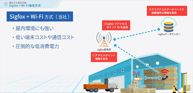 当社が開発した物流遠隔監視システム「Long-lifetime Asset Tracker」は、Sigfox社の低消費電力で広範囲をカバーする通信技術LPWAと、Wi-Fi®アクセスポイントによる位置情報を組み合わせたSigfox Atlas Wi-Fi®サービスを採用しています。
